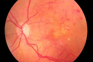 תמונה 1. קרקעית העין. ניתן לראות את ראש עצב הראייה, המקולה וכלי הדם של הרשתית.